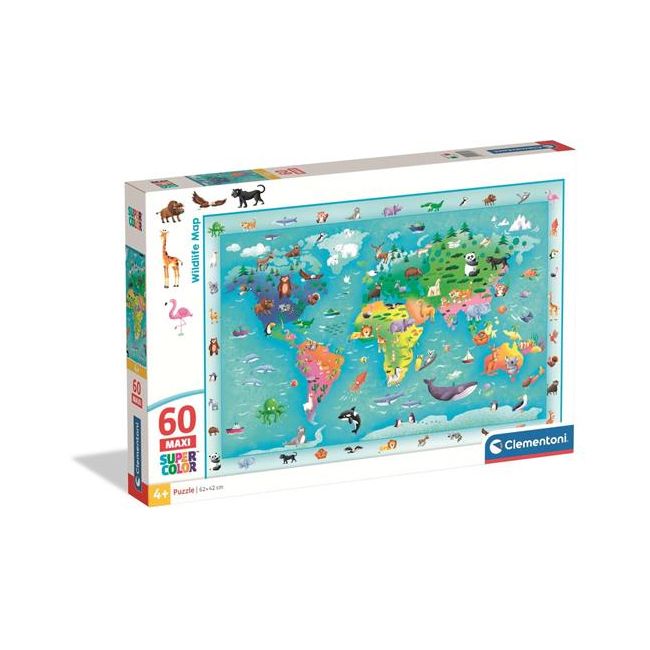 It features a vibrant world map adorned with illustrations of wild animals native to each continent, making it both fun and informative.