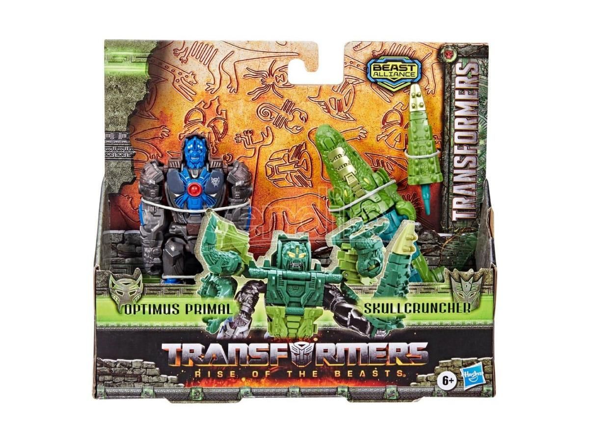 Optimus Primal, the strong Maximal leader, armors up for battle with his beast partner Skullcruncher. Classic Transformers robots and beast robots join forces in an epic alliance! Combine the Beast Alliance Beast Combiner 2-Pack Optimus Primal and Skullcruncher toys to gear up for battle! The battle on Earth is no longer between the heroic Autobots and the evil Decepticons. Transformers: Rise of the Beasts introduces mysterious factions, the Maximals, the Predacons, and the Terrorcons, in an epic 90s globetrotting adventure. Build the ultimate beast alliance and gear up for battle with Transformers Beast Alliance kids toys inspired by the new Transformers movie, Transformers: Rise of the Beasts!