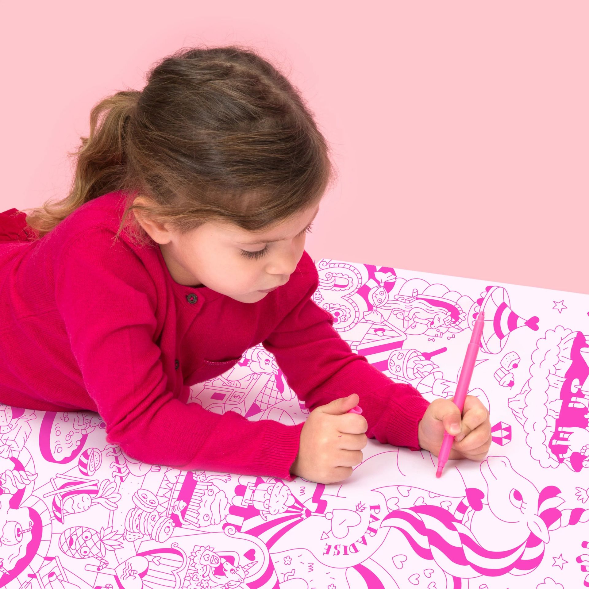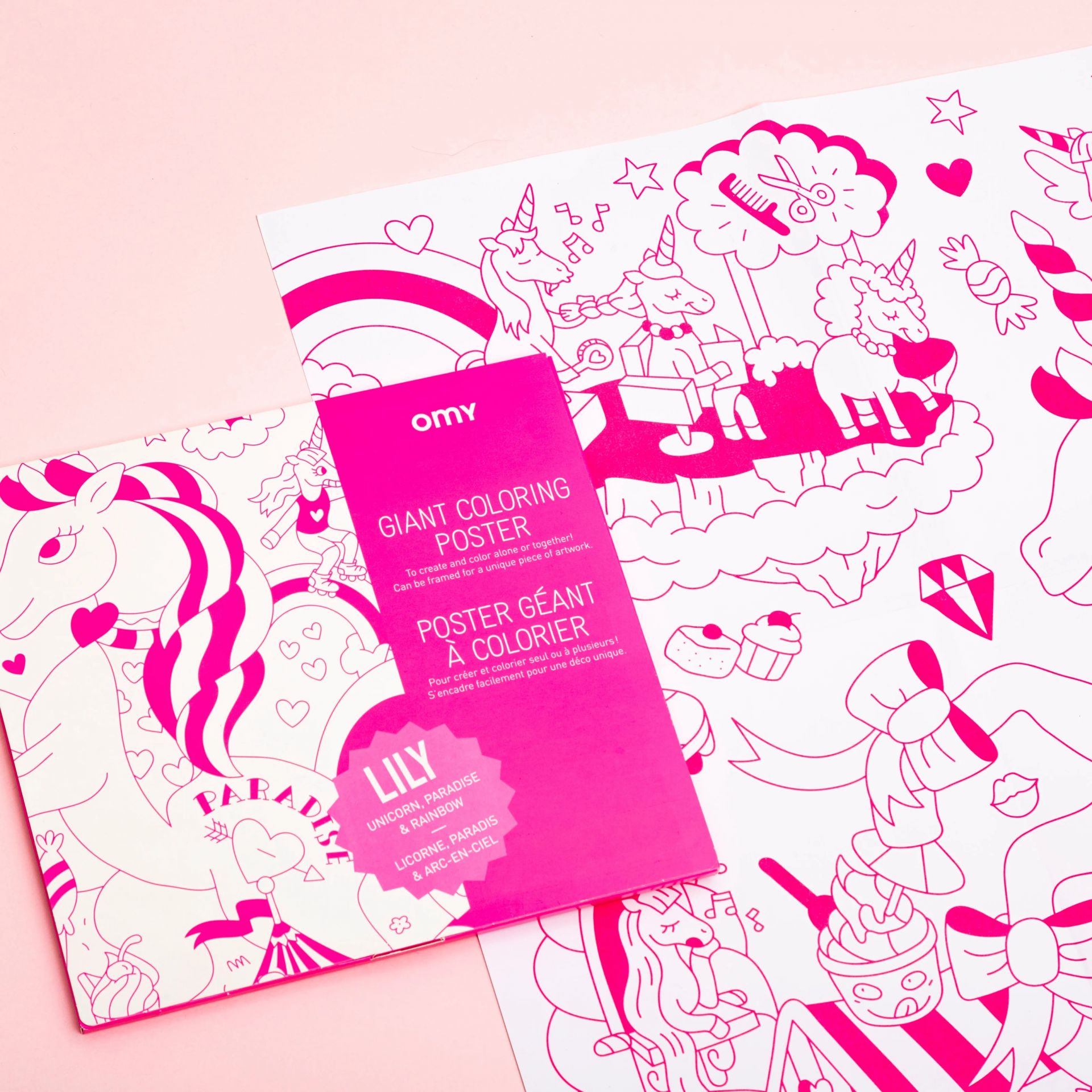 In a magical setting, rainbows, Lily and her wonderful world come to life... For the first time, the features of OMY drawings are dressed in neon pink A limitless artistic space for coloring alone or with others, to unfold on the ground, to hang on the wall or to use as a tablecloth.