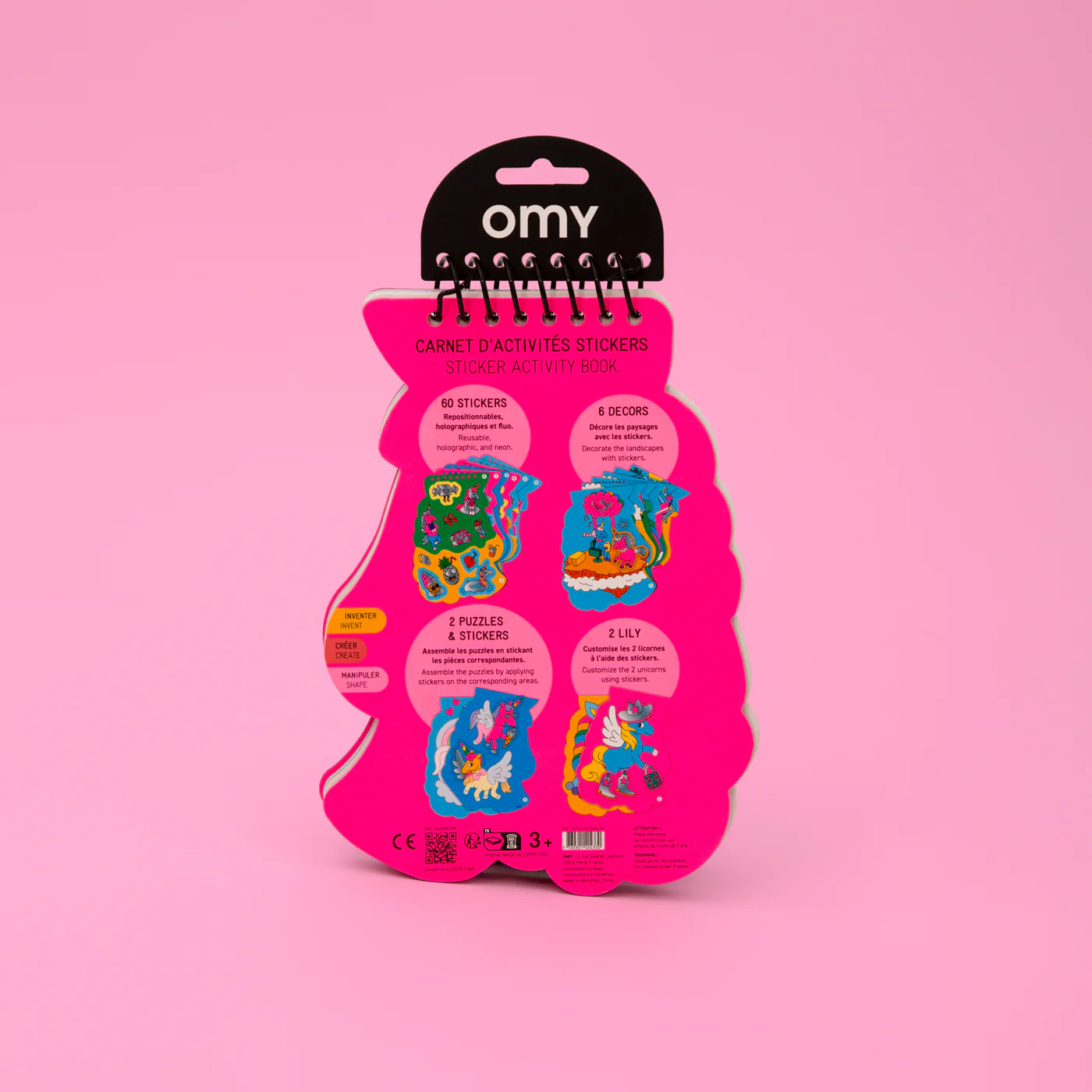 Activity notebook with fun, neon, gold, and holographic stickers, featuring iconic OMY illustrations. The perfect size to keep little ones entertained, recreate scenes, and develop their imagination.